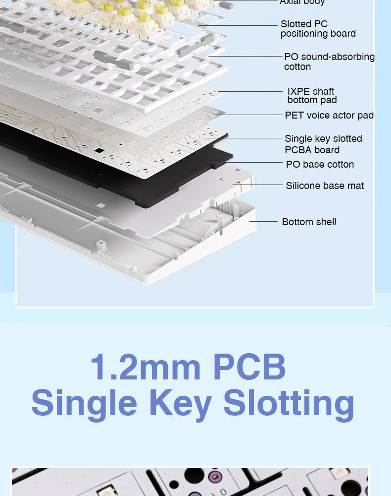 F75 gamer mechanical keyboard is a high-end gasket-mounted keyboard with a PC plate. The keyboard also has a 5-layers premium silicone pads and noise reduction cotton to reduce 95% hollow noise,abosord typing noise,and enhance the unique soft and comfortable rebound of the Gasket structure.